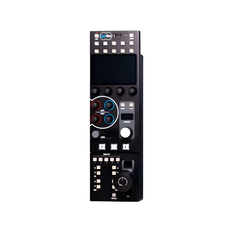 Le RCP Cyanview est un pupitre de shading universel sur IP qui permet de contrôler presque n’importe quelle caméra de n’importe quelle marque (studio, PTZ, mini‑cam, ENG, ciné, etc…) depuis une seule interface. Il reprend l’ergonomie d’un RCP classique avec encodeurs rotatifs, joystick/iris et un écran pour accéder vite à l’iris, gain, balances, gamma, matrices couleur et menus avancés. Un seul RCP peut piloter un grand nombre de caméras grâce à notre licence illimité.